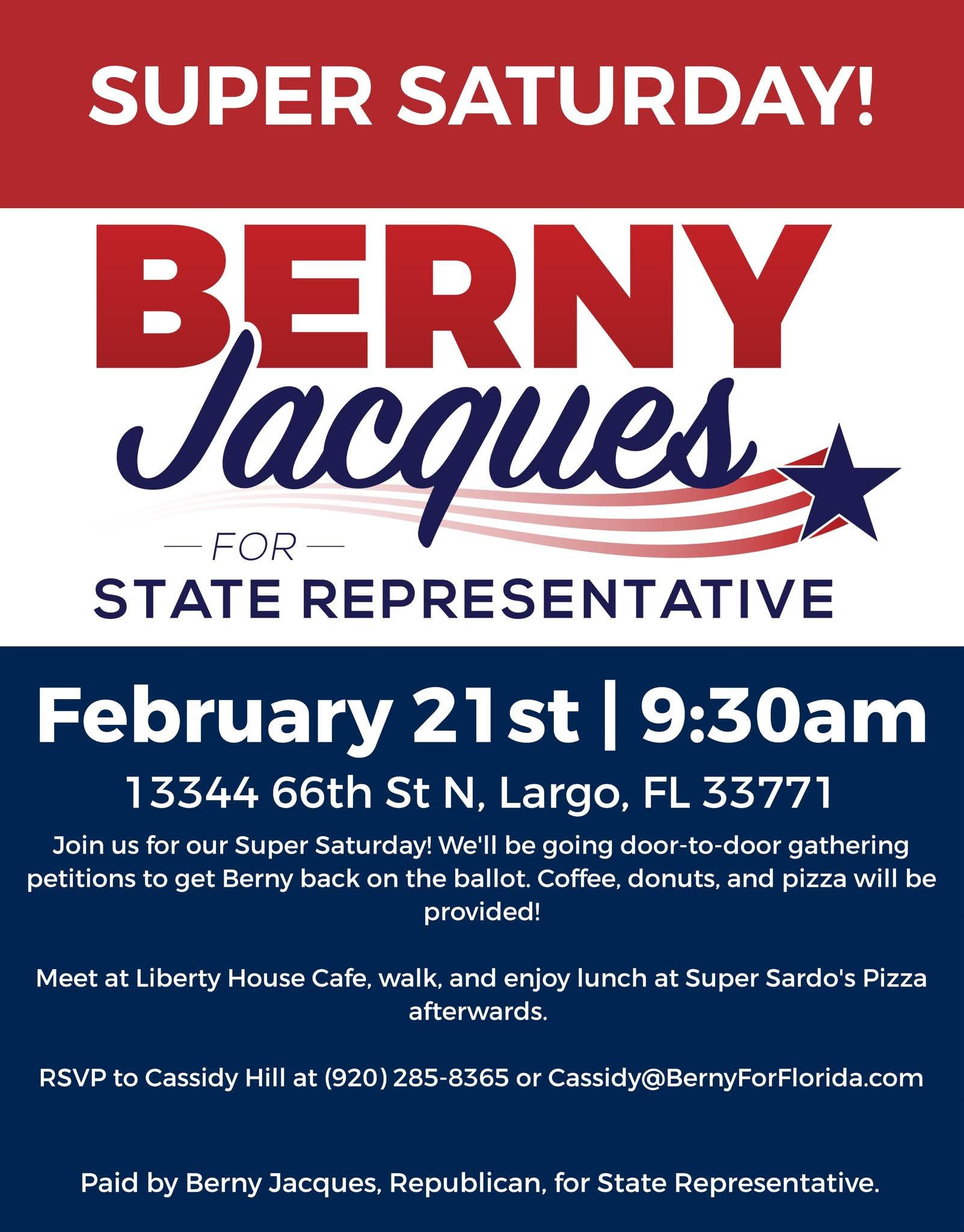 Berny Jacques Needs UsSuper Saturday February 21stPinellas WatchdogsFeb 01, 20261ShareCome join us Saturday February 21st to walk for Berny and help get him on the ballot so he can continue to make Pinellas Great Agaain!!